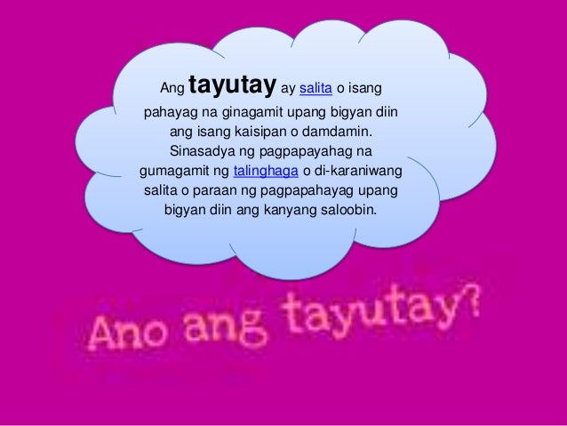 Tulad ng paris ng kawangis ng tila sing- sim- magkasing- magkasim- at iba pa. Simili o Pagtutulad - di tiyak na paghahambing ng dalawang magkaibang bagay. Tayutay Ang tayutay ay salita o isang pahayag na ginagamit upang bigyan diin ang isang kaisipan o damdamin.